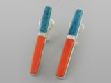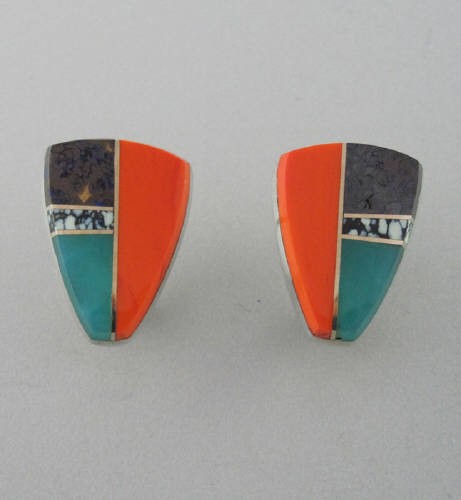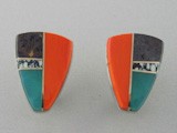 Earrings inliad with turquois, orange chalcedony, rosarita, and 14kt gold.
