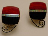Earrings inlaid with rosarita, black jade, and 14kt gold.