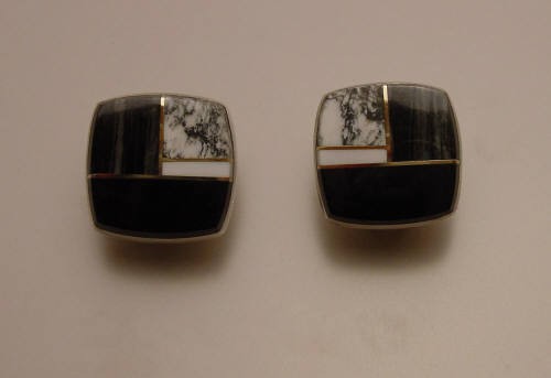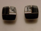 Earrings inlaid with black jade, calkacyderite, pristine, arizona zebrastone, and 14kt gold. Dim are 3/4 inch (lg) x 3/4 inch (wi).