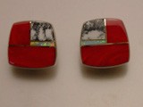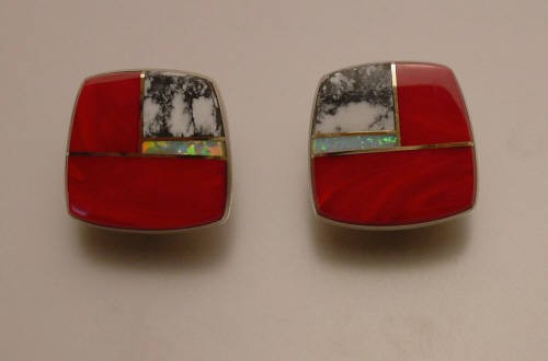 Earrings inlaid with rosarita, opal, and 14kt gold.