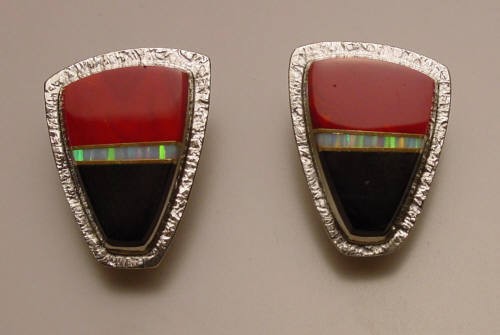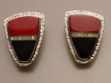 Earrings inlaid with rosarita, opal, black jade, and 14kt gold.Dim are 1 inch (lg) x 3/4 inch (wi).
