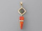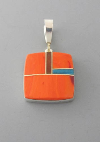 Penadant inlaid with turquois, orange chalcedony, rosarita, and 14kt gold. Bail is accented with 14kt gold.