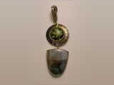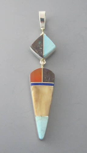Pendant inlaid with gem silica, turquois, arizona zebrastone, prystine, and 14kt gold. Bail can be moved to rotate pendant and can also be worn as pin.