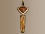 Pendant set with opalized ironestone. Hand-textured fan shaped accents with lightening designed bail. Dim. 1 3/8 inches (lg) x 1 inch (wi).