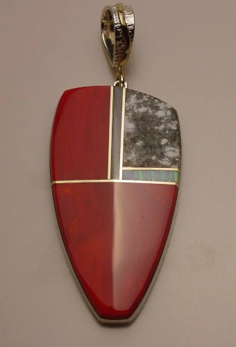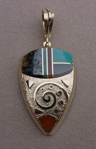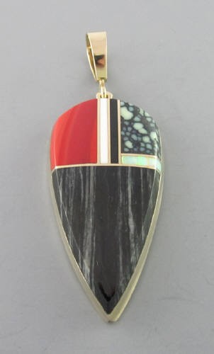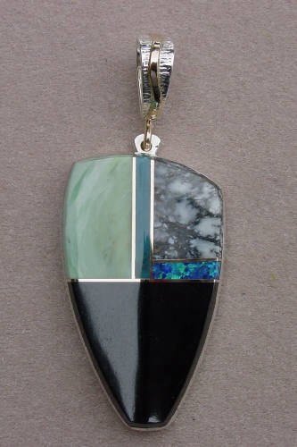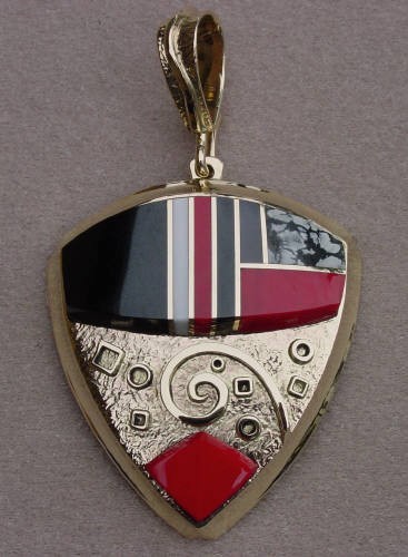 Pendant inlaid with rosarita, black jade, opal, turquois, and 14kt gold.
