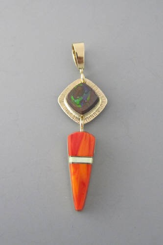 Pendant inlaid with boulder opal, rosarita, opal, and 14k gold