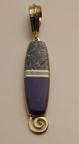 Pendant inlaid with calkacyderite, opal, lapis and 14kt gold. Dim. 2 1/4 inch (lg) x 1/2 inch (wi).