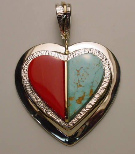 Pendant inlaid with turquois, rosarita, and 14kt gold.