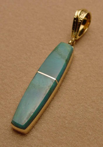 14kt gold pendant with lightening bail. Set with madagascar agate and damollie turquoise. Dim. 2 3/4 inches (lg) x 7/8 inch (wi).