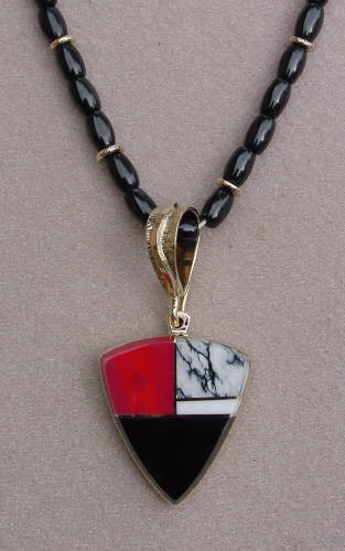 Inlaid with black jade, prystine, opal, rosarita, turquois, and 14kt gold