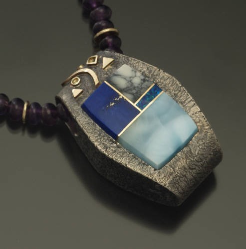 Pendant inlaid with calkacyderite, rosarita, opal, blue calcedony, black jade, and 14kt gold.