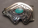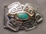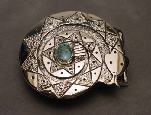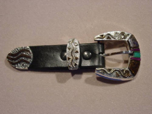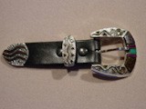 Inlaid with Opalized Ironstone, Sugilite, Turquoise, and 14kt gold. Gold accents are 14kt also. Ranger Set fits 1 1/4" belt. sold