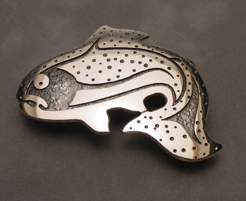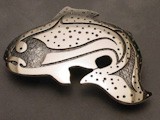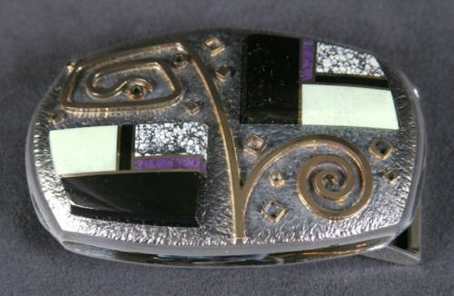 Inlaid with opal, black jade, calkacyderite, sugilite, and 14kt gold. Also overlaid with 14kt gold.