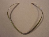 14kt yellow gold, hammered textured, and hand forged collars. The quality of the materials, technique, and fit are what I'm most proud of, taking 26 years to improve upon. These are items that stand above all other look alikes. These also come in high polish or satin finishes. The styles vary from a round shape(view image #2) to a more contemporary angular look. We guarantee fit and comfort. Upon order specify shape and/or finish. Length 13"x3/8"wide. $3200