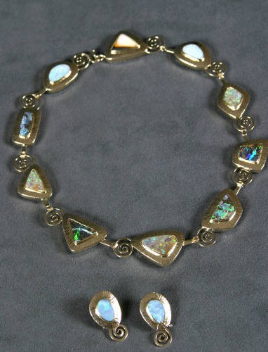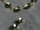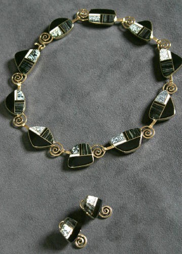 Both the necklace and earrrings are inlaid with black jade, arizona zebra stone, calkacyderite, pristine, and 14kt gold.