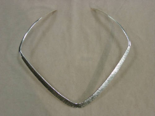 Sterling Silver, The same process and technique as described previously in #1 V-shape, only in silver. Our pendant drops are designed to compliment our collars as an ensemble that will truly be unique. Length 13"x 3/8"wide.