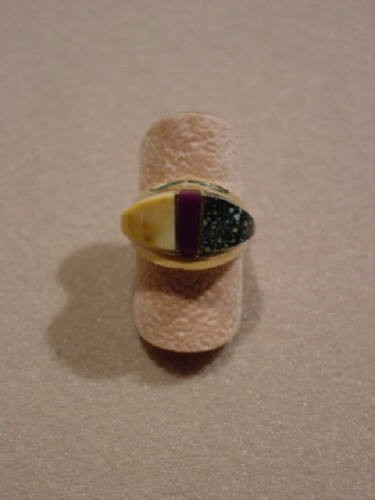 Inlaid with Fossilized Ivory, Sugilite, Calkacyderite, and 14kt gold. Size 7 shown