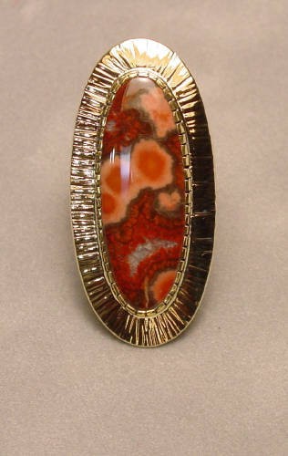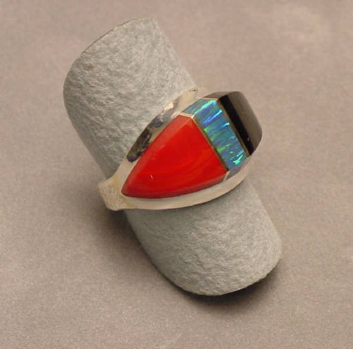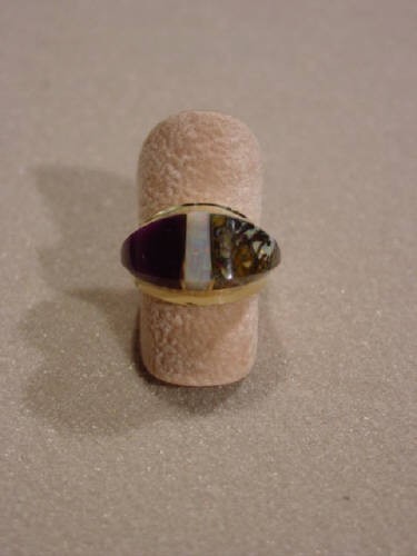 Inlaid with Sugilite, Opal, Opalized Iron Stone, and 14kt gold. Size 7 shown.