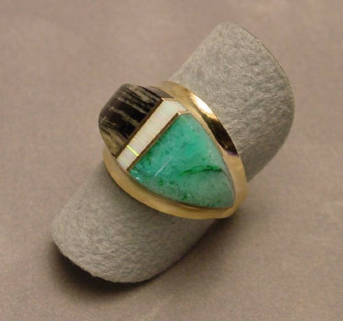 Inlaid with chrysoprase, opal, arizona zebra stone, and 14kt gold